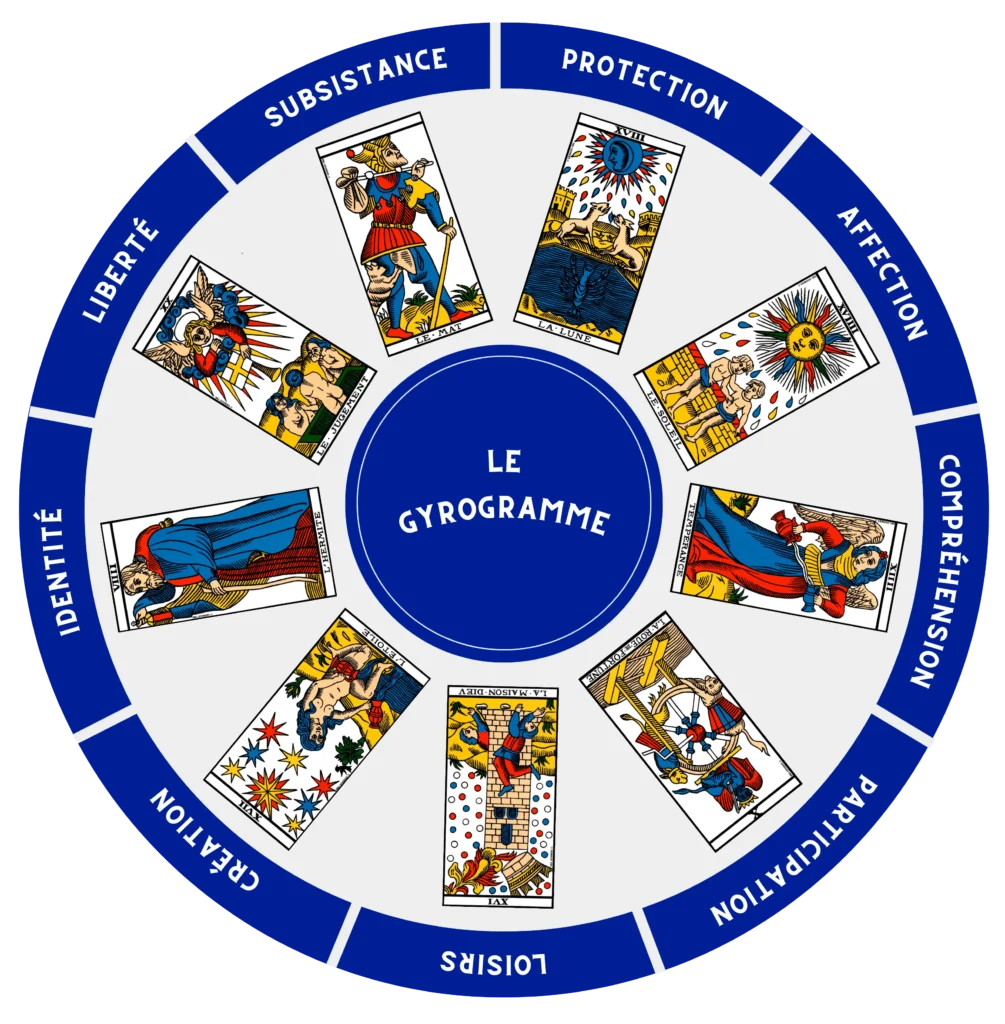 Tu souhaites engager un travail personnel approfondi pour mieux te connaître, comprendre tes mécanismes, tes entraves, tes potentiels et surtout tes besoins essentiels pour te sentir épanoui(e) ? Alors il faut absolument que tu essayes le Gyrogramme, un thème tarologique inédit que j’ai créé en 2024. Ce thème t’invite à explorer tes neuf besoins humains fondamentaux : la subsistance, la protection, l’affection, la compréhension, la participation, le loisir, la création, l’identité et la liberté.
